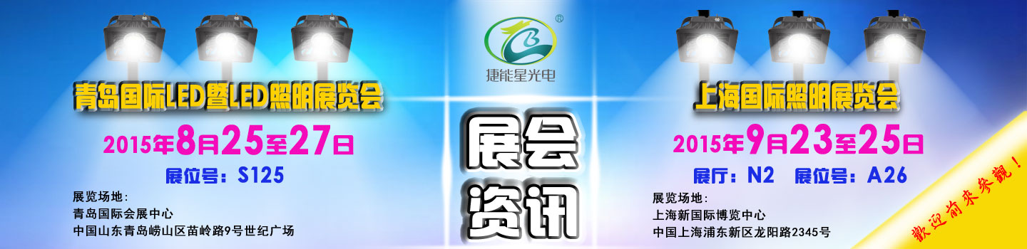 捷能星光電受邀參加8月份“2015第十屆中國(青島)國際LED暨LED照明展覽會”與9月份“上海國際照明展覽會,屆時本公司將帶最新LED工礦燈/LED塔吊燈/LED泛光燈等各類LED產品參與展覽,歡迎前來參觀,期待您的光臨!