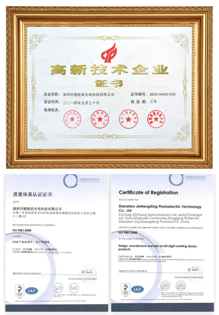 捷能星作為國家級高新技術(shù)企業(yè)在國內(nèi)外大功率LED照明市場已占據(jù)很大的市場份額,已申請專利30多項,產(chǎn)品已通過美國UL、DLC、歐盟CE、日本PSE、FCC、SAA、ROSH等國際認證。捷能星期待與全球的合作伙伴共創(chuàng)Led照明行業(yè)的美好未來。